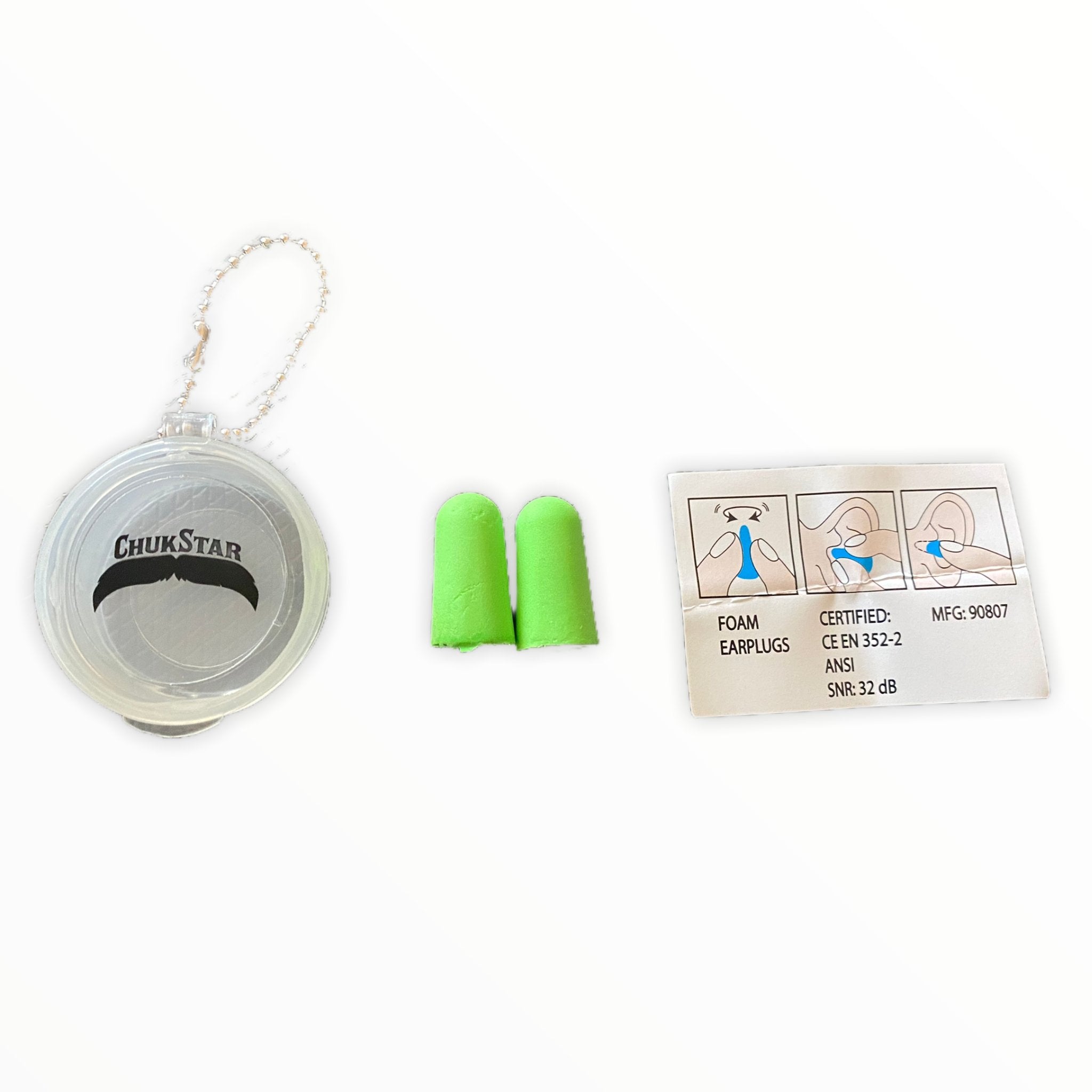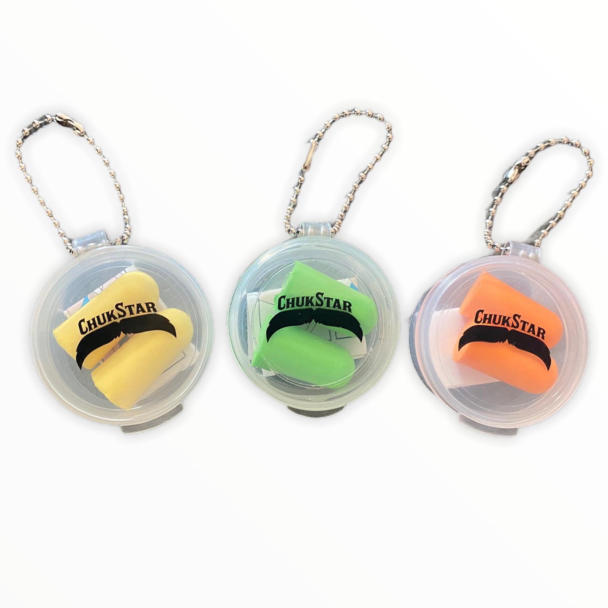 Our ChukStar logo branded plastic earplug case with keychain ring will keep your ear plugs clean and handy in between uses.